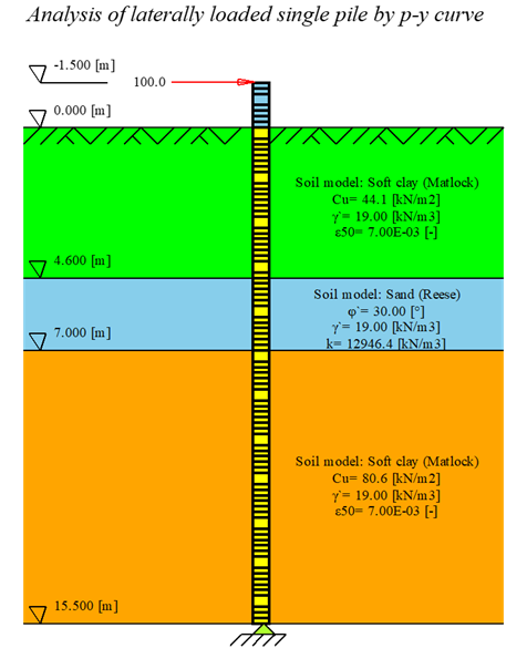 Analysis of laterally loaded single pile using P-y curve by Program GEO ToolsPart II: Verification ExamplesThe Analysis of laterally loaded single pile by P-y curve program offers a simple user interface while enabling advanced analysis options for both academic and practical applications. It supports multiple nonlinear soil models through P-y curves representing a variety of ground conditions, including soft clay, stiff clay (with and without water), sand, API-based soils, modified stiff clays, c–φ soils, silt, weak and strong rock, loess, and liquefied soils. The pile is modeled as a beam element, with the option to choose between Euler-Bernoulli and Timoshenko beam theories. The program generates the pile stiffness matrix and incorporates nonlinear soil springs derived from selected P-y curves to form a pile–soil stiffness matrix. This system is solved using three numerical methods: Finite Element Model with Euler beam (FEM_E), Finite Element Model with Timoshenko beam (FEM_T), and Finite Difference Model (FDM). In addition to soil nonlinearity, the program allows users to consider the nonlinear material behavior of the pile or column itself, with support for common structural materials such as steel and concrete. Users can define the pile as a linear elastic material, or select from several nonlinear cross-section types, including: